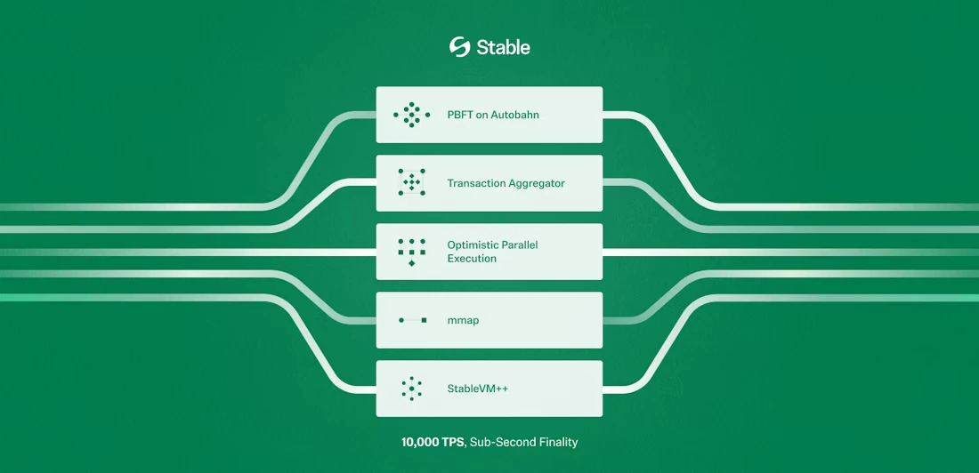 Initially, Stable Blockchain leverages StableBFT, a customized PoS consensus protocol built on CometBFT, to ensure high throughput, low latency, and strong reliability across the network. To further optimize consensus performance, Stable is planning to decouple data dissemination from the consensus process and implement direct transaction broadcasting to block proposer. To significantly accelerate consensus, Stable intends to upgrade its protocol to a DAG-based Autobahn. StableBFT, built atop Autobahn, will enable:- Parallel proposal processing by eliminating the single-leader limitation.