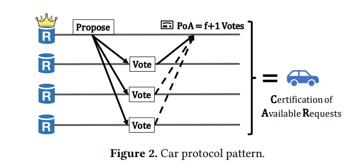 Autobahn is architected around a clear separation of responsibilities between its two core layers: a data dissemination layer and a consensus layer. This decoupling is inspired by the design of DAG-based systems like Narwhal, but Autobahn enhances this structure to support seamlessness and lower latency. The data dissemination layer is responsible for broadcasting client transactions in a scalable, asynchronous manner. It allows each replica to maintain its own lane of transaction batches, which can be propagated and certified independently of the consensus state. These lanes grow continuously, even when the consensus process stalls, ensuring that the system remains responsive to clients at all times. On top of this, Autobahn runs a partially synchronous consensus layer based on a PBFT-style protocol. However, instead of reaching agreement on individual batches of transactions, consensus is reached on “tip cuts,” which is compact summaries of the latest state of all data lanes. This design allows Autobahn to commit arbitrarily large amounts of data in a single step, minimizing the impact of blips. Compared to HotStuff, which tightly couples data and consensus and stalls when a leader fails, and Bullshark, which incurs high commit latencies due to DAG traversal and data synchronization, Autobahn provides a smoother and faster consensus experience. It inherits the parallelism of DAGs while avoiding their latency pitfalls.Data Dissemination Layer: Lanes and Cars